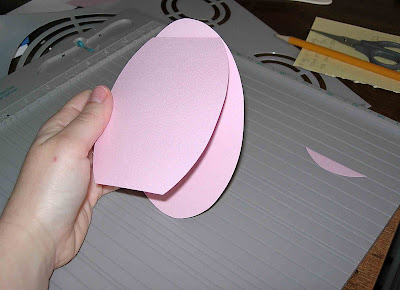 To create my card, I used an oval template. Believe it or not, I have NO diecutting system, no circle cutter, oval cutter, or any other fancy tool. Just a template. (This one happens to be from CTMH.) My oval is about 4x5.5, so it will fit in a standard invitation size envelope. To get started, I traced TWO matching ovals and cut them out. One will be the front, and one will be the back of the card.